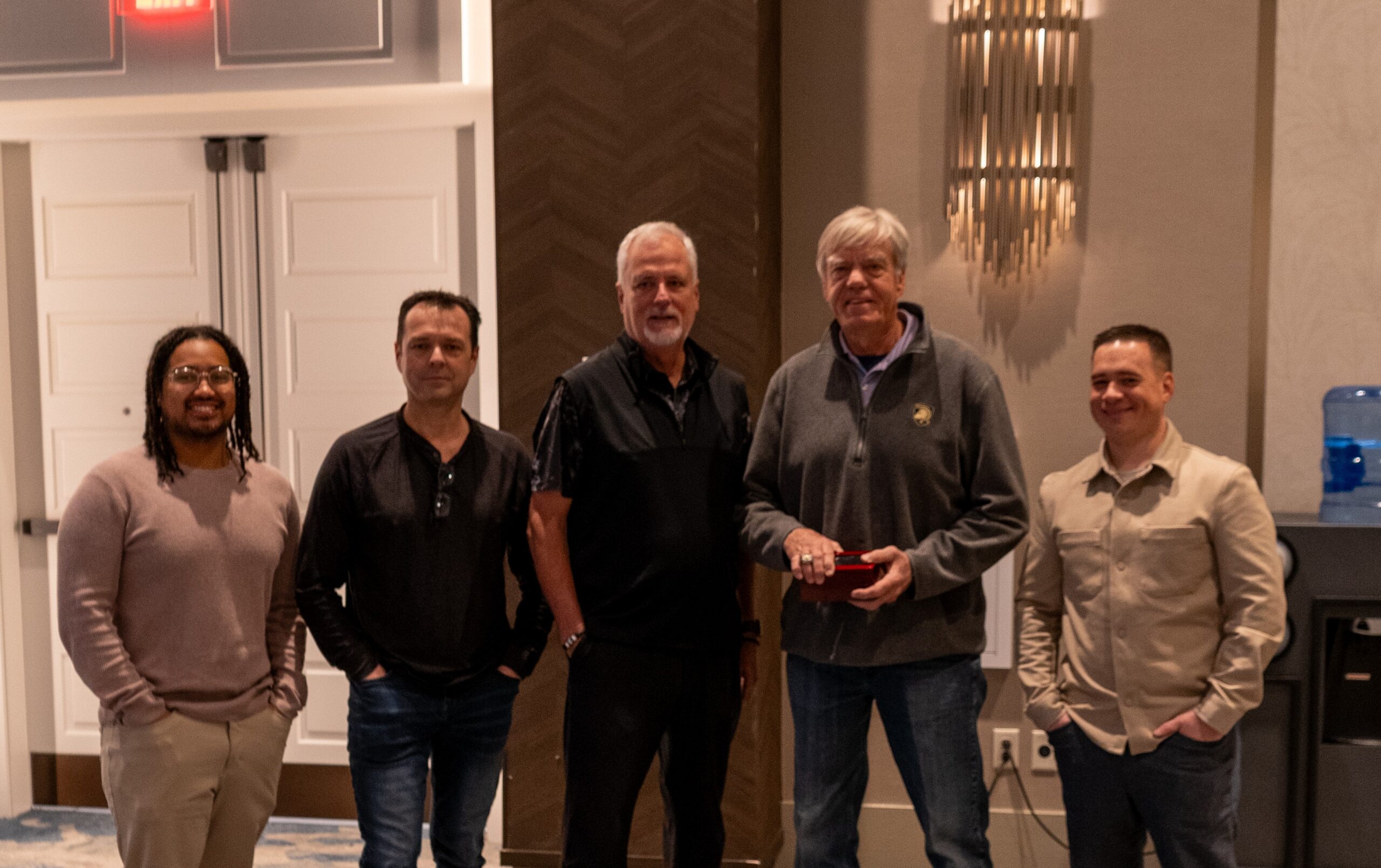 Chuck Hawke pictured, holding his ring and joined by the Kansas City Royals clubhouse managers at the 2025 MLB winter meetings.